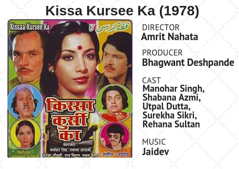 Kissa Kursee Ka was directed by Amrit Nahata, a two-time Congress MP who later joined the Janata Party and served another term in the Lok Sabha. The film is now considered one of Bollywood’s best political dramas with the original star cast featuring Manohar Singh, Shabana Azmi, Utpal Dutt, Surekha Sikri, Rehana Sultan and others. It maps the political trajectory of a quack drug seller, Gangaram’s (Manohar Singh) rise to become the president of Jan Gan Desh. Kissa Kursee Ka shows us how a politician can be ‘manufactured’ — said to be a spoof on Sanjay Gandhi’s auto manufacturing project — when capitalist forces come together.