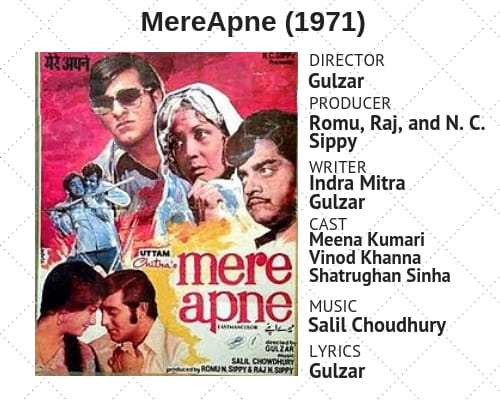 In Mere Apne, Gulzar, still finding his feet as a maker after a long apprenticeship with Bimal Roy and Hrishikesh Mukherjee, weaves in poetry and angst.