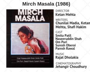 Based on a short story by Chunilal Madia, Mirch Masala is a story about oppression – of a subedar on a village in pre-Independence Rann of Kutch; of a village chief on his wife and other young women in the village; of a father on his young daughter; and of the colonial system on a poor nation and its people.