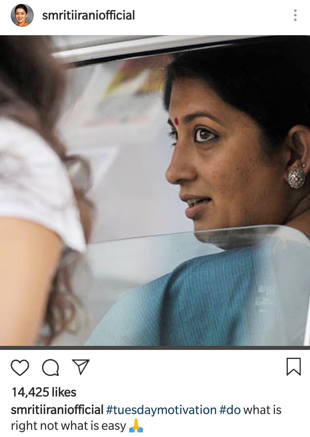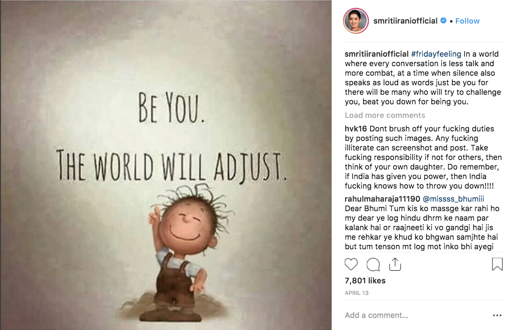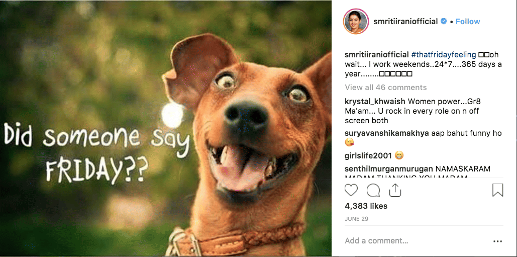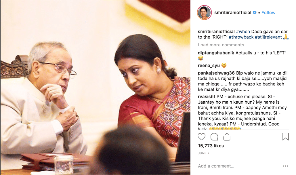 For one, Irani’s Instagram account is rarely political. Apart from a few pictures with politicians (shoutout to BJP MP Subramanian Swamy, former President Pranab Mukherjee and union minister Piyush Goyal), posts celebrating the Army’s achievements, or the odd smiling photograph with female constituents, Irani largely refrains from showcasing her political avatar here.
