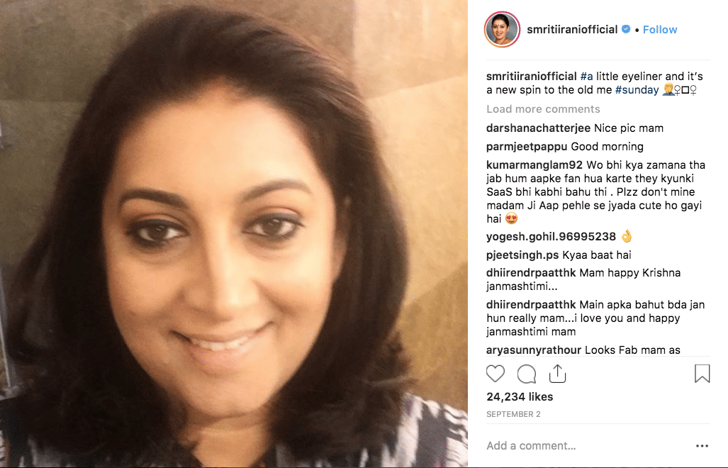 One of Union minister Smriti Irani’s recent posts was captioned ‘a little eyeliner and it’s a new spin to old me’.