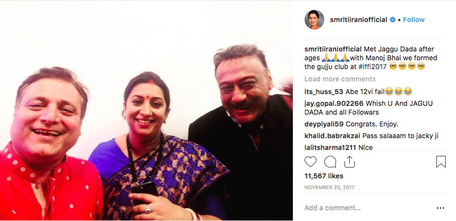Silence surrounding Padmaavat: In November 2017, the opposition, and even voices within the BJP, criticised the I&B ministry’s silence over the Padmaavat protests and the death threats issued to its team. Meanwhile, Irani was forming a #gujjuclub with actors Jackie Shroff and Manoj Joshi at the 2017 International Film Festival of India.