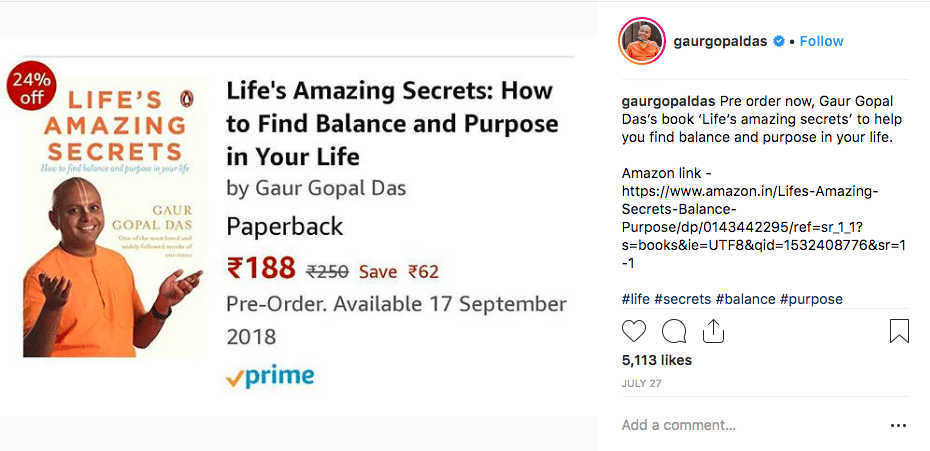 It’s also interesting to note that Irani’s guru, Gaur Gopal Das, has an Instagram account of his own. Follow @gaurgopaldas for ‘Life’s Amazing Secrets: How to find Balance and Purpose in your life’, and other motivational lessons.