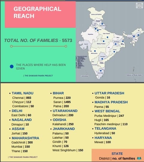 Even though she started The Shakkar Para Project (TSPP) on 30 March as a self-funded project, Seksaria invited funding online through Milaap on 4 April. TSPP has since reached around 5573 families in 14 states.