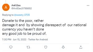 “Donate to the poor, rather than damage it and by showing disrespect for our national currency you haven’t done any good job to be proud of,” wrote a Twitter user.