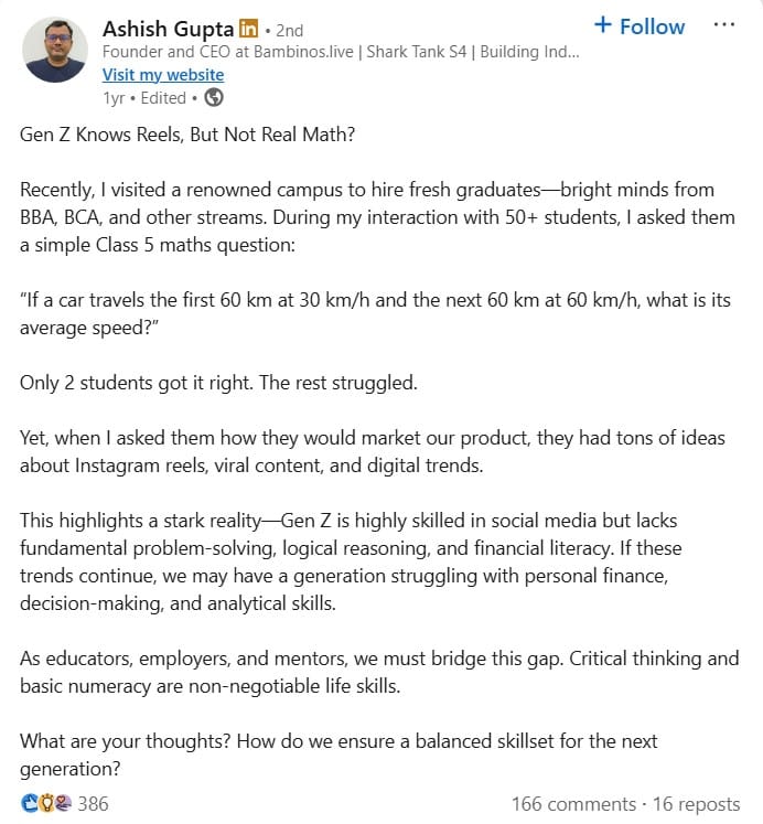 In his write-up titled ‘Gen Z Knows Reels, But Not Real Math?’, he argued: “Gen Z is highly skilled in social media but lacks fundamental problem-solving, logical reasoning, and financial literacy”.