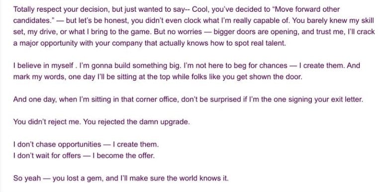 “You didn’t reject me. You rejected the damn upgrade,” said the letter in question. “And one day, when I’m sitting in that corner office, don’t be surprised if I’m the one signing your exit letter.”