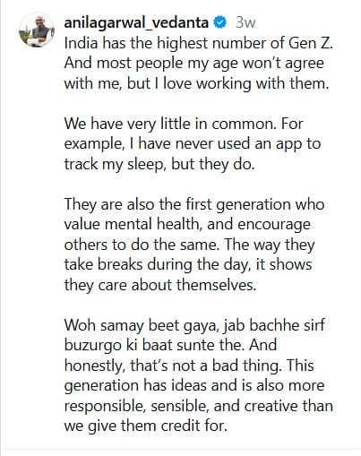 “Woh samay beet gaya, jab bachhe sirf buzurgo ki baat sunte the” (Gone are the days when young people only obeyed their elders), wrote 72-year-old Vedanta Group chairman Anil Agarwal in an Instagram post about working with Gen Z. “The way they take breaks during the day, it shows they care about themselves. Instead of expecting them to become more like us, maybe we need to be more like them.”