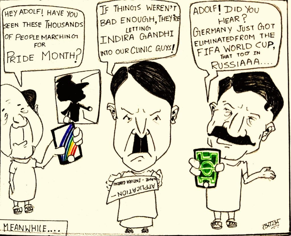 As Jaitley leads Indira to the doors of the centre, Hitler, not exactly known for his ability to patiently await instructions, decides to scan the session moderator’s desk for more information about the identity of this mysterious new member. In the absence of direct supervision, the dictators regress to doing what they know best — waging wars with each other.