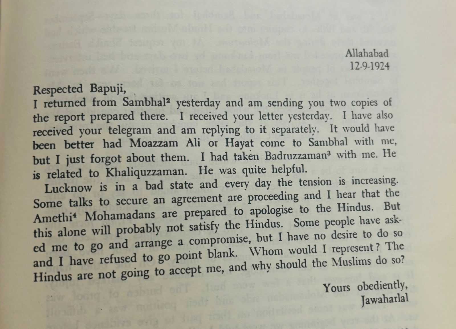In his letter to Gandhi, accompanying two copies of the report he’d prepared — written from Anand Bhavan in Allahabad on 12 September 1924 — Nehru briefly describes communal tensions in Lucknow, Amethi and Sambhal. Talks were on to “secure an agreement” between the Hindus and Muslims, and he writes that Muslims are prepared to apologise to the Hindus — but that this alone will not satisfy the Hindus.