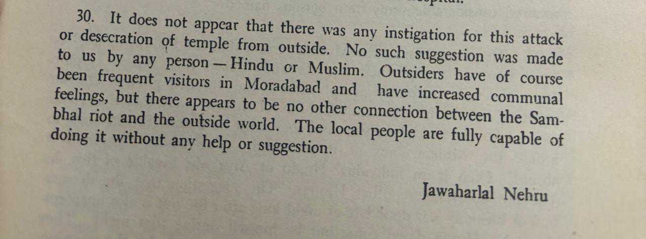 “It does not appear that there was any instigation for this attack or desecration of temple from outside. No such suggestion was made to use by any person — Hindu or Muslim,” writes Nehru bluntly in the concluding paragraph of his report. “Outsiders have of course been frequent visitors in Moradabad and have increased communal feelings, but there appears to be no other connection between the Sambhal riot and the outside world. The local people are fully capable of doing it without any help or suggestion.”