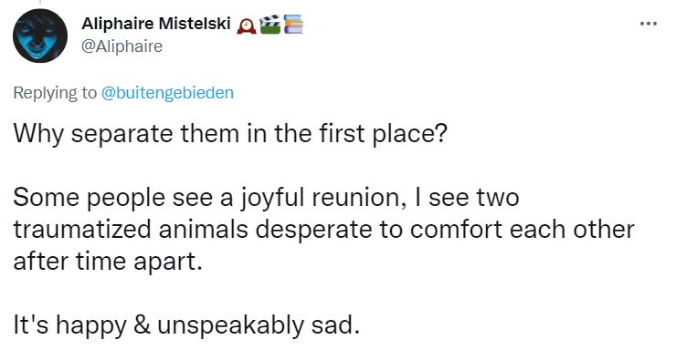 Another one shared, “Why separate them in the first place? Some people see a joyful reunion, I see two traumatized animals desperate to comfort each other after time apart. It’s happy and unspeakably sad.”
