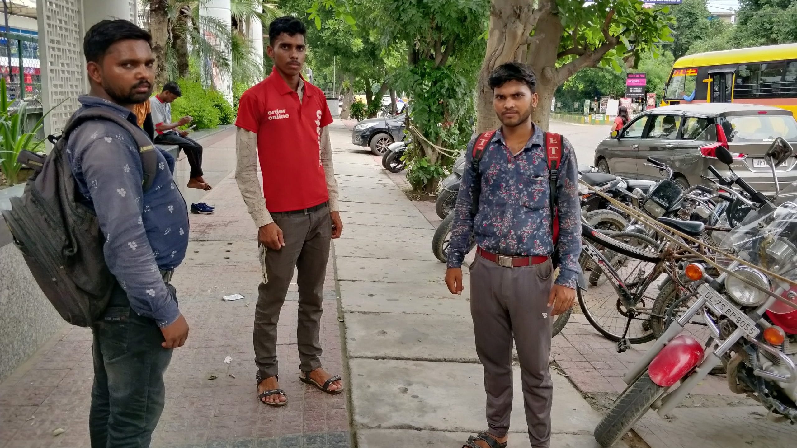 (From L to R) Chanderpal, Obendra Yadav and Arvind Yadav outside the cycle parking spot in Indirapuram Habitat Centre, Ghaziabad. While Obendra and Chanderpal continue to work with Zomato, Arvind’s Zomato ID was blocked in April one rainy day after a customer complained. He now works as a delivery person with Shadowfax | Photo: Sonal Matharu | ThePrint