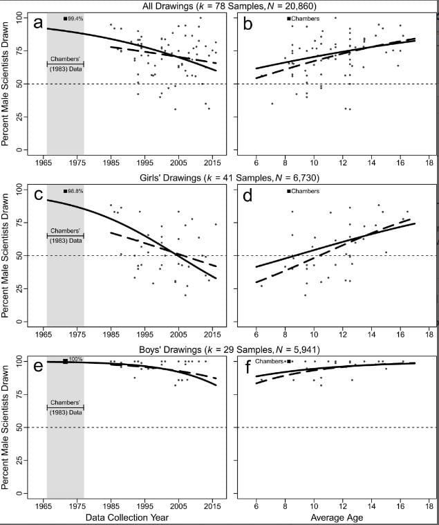His new study examined five decades’ worth of this test, analysing drawings by 20,000 children between 1985 and 2016. The good news: as time went by, more children drew female scientists.