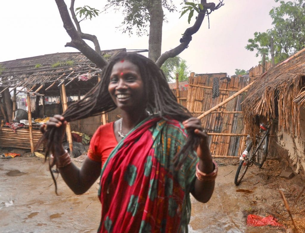 Her daughter Kajal is playing by the roadside at dawn on a rainy day, along with other children of the hamlet, all drenched. Shanti tells her to put on a frock, one of two nice ones she owns, for our photos. Soon after, the child is back by the slushy road, frock discarded, among a group of kids chasing a rounded stone with sticks.
