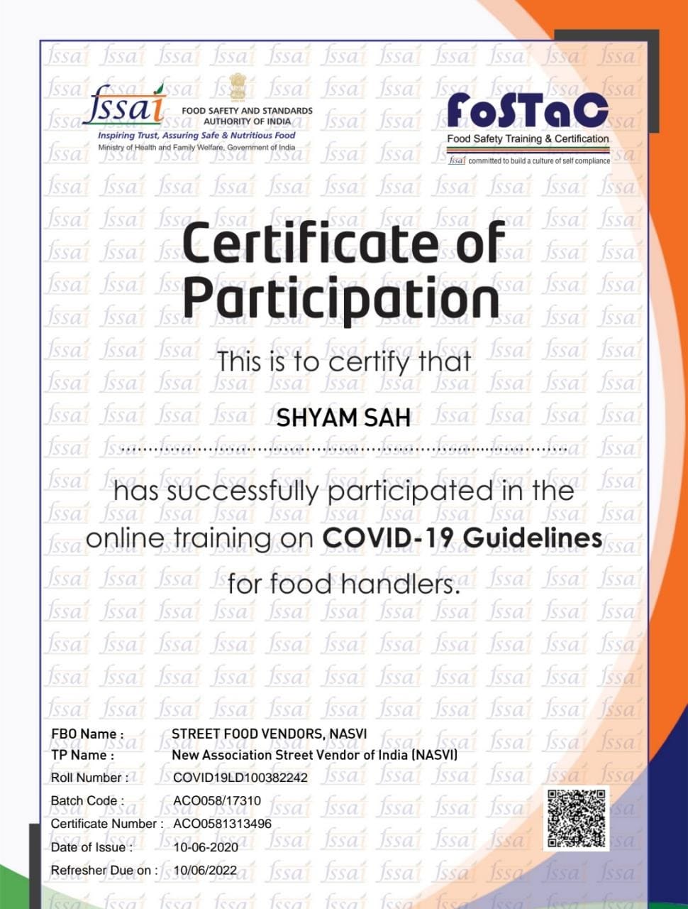 Varma is one of 1,500 street food vendors across India who have completed digital training on Covid-19 food safety guidelines, facilitated by the Food Safety and Standards Authority of India (FSSAI) in partnership with the National Association of Street Vendors of India (NASVI). Many like Varma have received a food safety training and certification (FOSTAC) that they display on their carts or stalls.