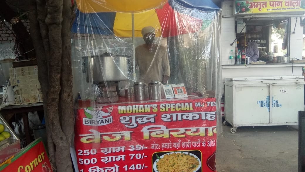 Mohan Singh Varma is 42 years old. He sells biryani by day and momos by night near Delhi’s Preet Vihar Metro Station, but he now hands out his plates through partitions in the plastic sheets that ensconce his cart.