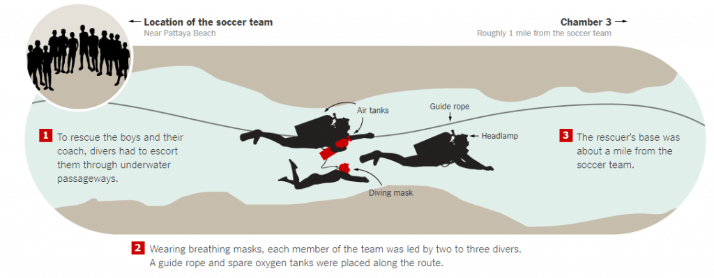“Cave diving is a different beast from diving in the open waters. The water can be so muddy that divers have to feel their way out. The passage can be so narrow that you have to take off your oxygen tank. And you cannot simply swim up to safety. By Tuesday morning, divers had miraculously guided all 12 of the boys and their coach out of the cave under these conditions,” The Atlantic reports.