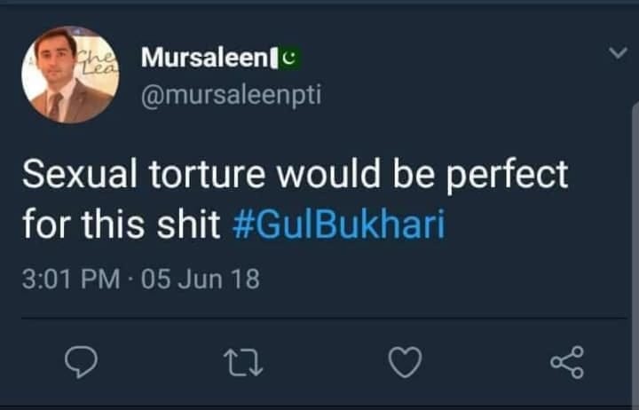 The student, PTI activist Mohammed Musraleen, tweeted, “Sexual torture would be perfect for this shit #GulBukhari” on June 5.”
