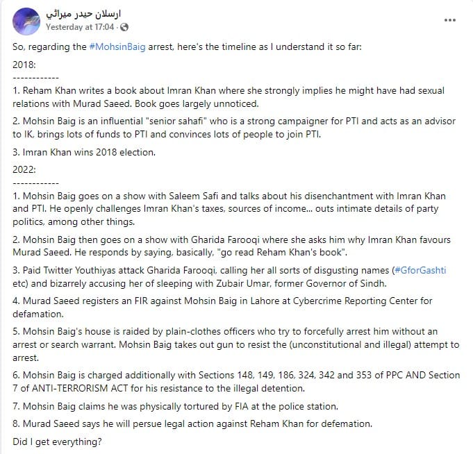 Arrest of Mohsin Baig, once a fast friend of IK, shows how panicked the regime is. Niazi sb gives long sermons on democray & morality but cannot stand even minor criticism. Free speech has vastly been curtailed in last 3.5 years of his rule. It is worst time in nation's history.