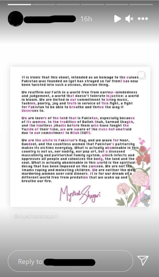 “It is ironic that this shoot, intended as an homage to the values Pakistan was founded on (yet has strayed so far from) has now been twisted into such a vicious, divisive thing,” read the statement.