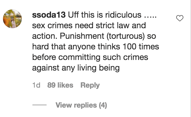 Another user, however, felt the situation was “ridiculous”. “Sex crimes need strict law and action. Punishment (torturous) so hard that anyone thinks 100 times before committing such crimes against any living being,” they said.