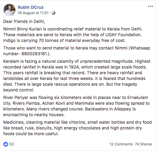 According to a Facebook post by Rubin D’Cruz, an assistant editor at the National Book Trust of India and alumnus of the University of Kerala, IndiGo Airlines was ferrying 70 tonnes of material to Kerala daily for free.