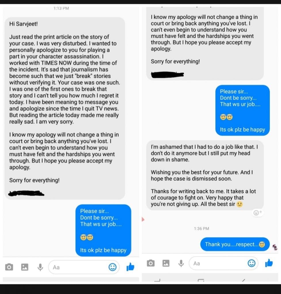 “Just read ThePrint article on the story of your case. I was very disturbed. I wanted to personally apologise to you for playing a part in your character assassination. I worked with TIMES NOW during the time of the incident,” the former Times Now employee wrote to Sarvjeet through Facebook messenger.