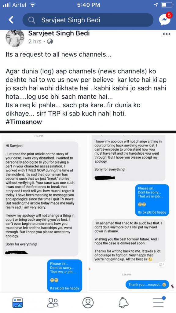 Sarvjeet later put a post on his Facebook wall, along with a screenshot of his conversation with the journalist, urging news channels to be responsible and verify facts before putting out stories.