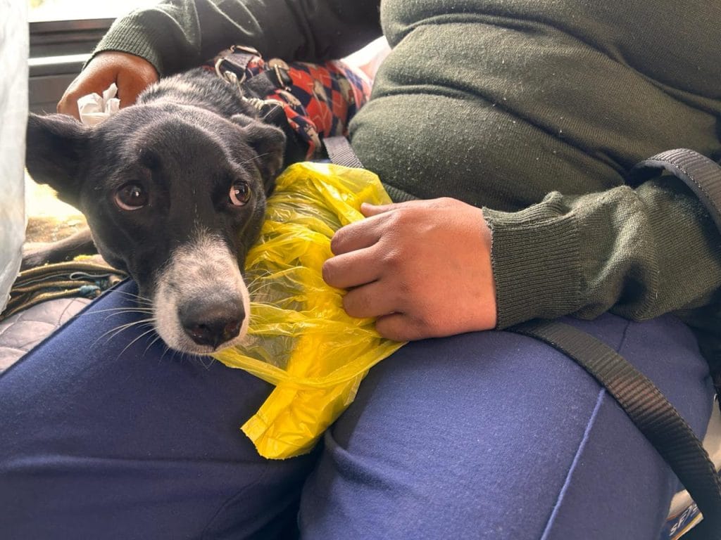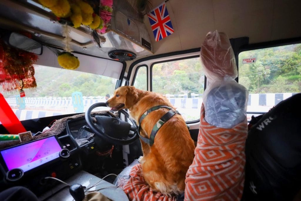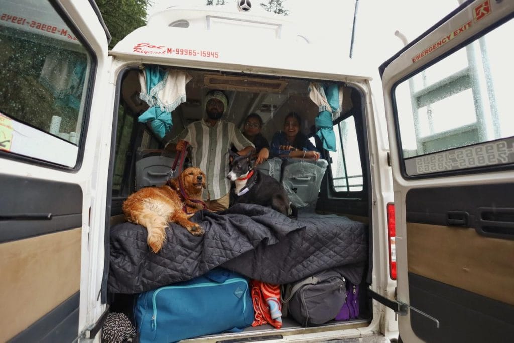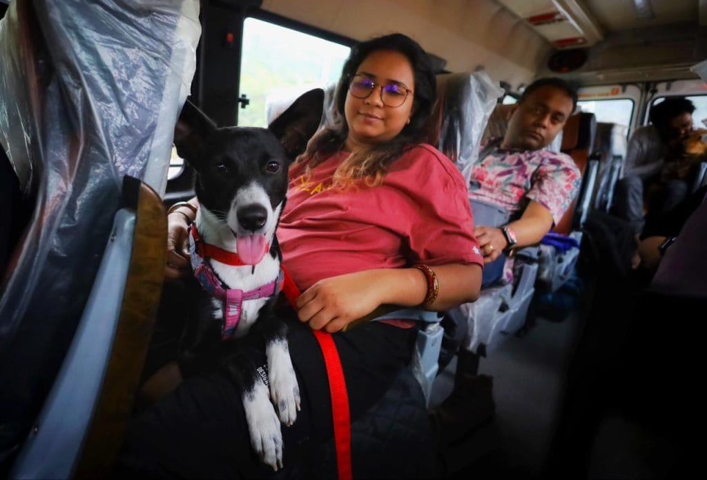 All set, the team allotted seats on the bus. Suzie went first, tail wagging nonstop, two paws up, struggling to climb until Himanshu pushed her in, with a fond “there you go”. Zoey climbed the stairs like an ace. Taco, the youngest, bounded up last.