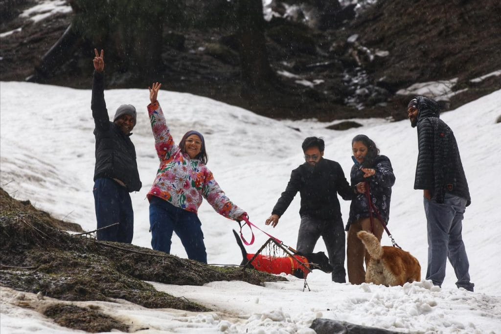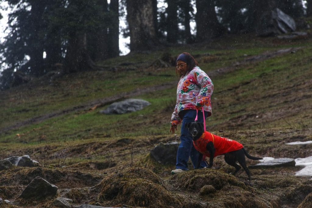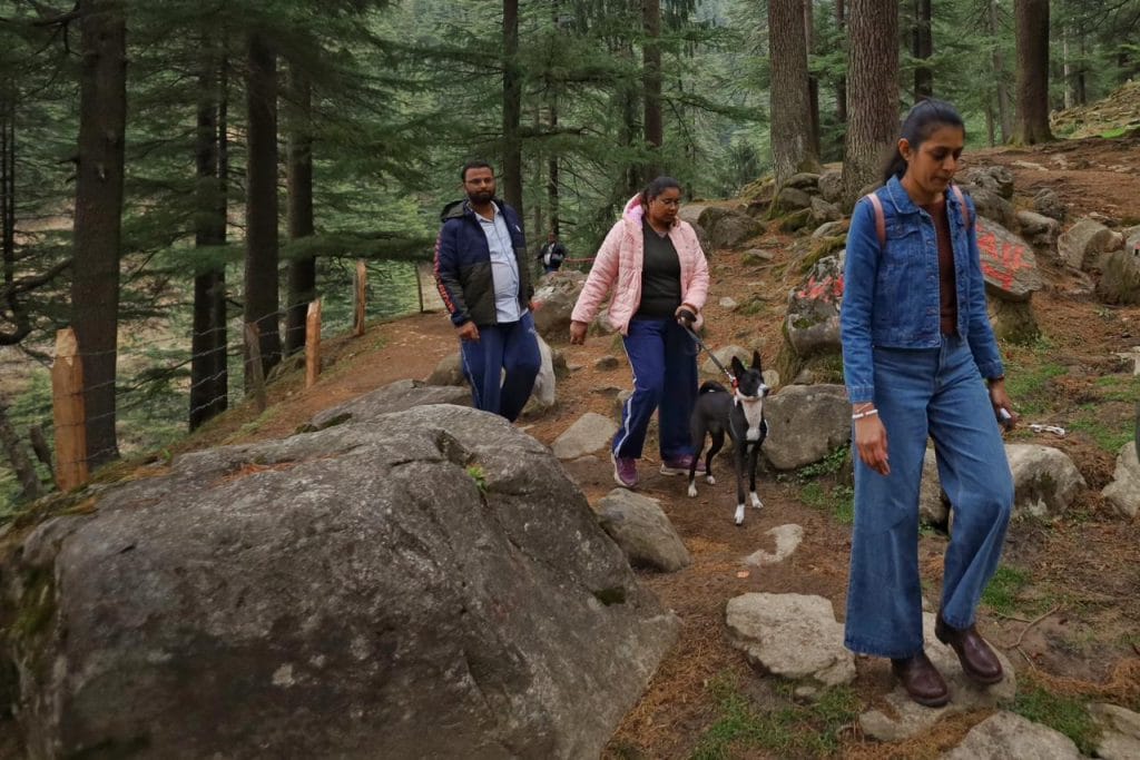 This is Suzie’s second trip to the mountains. The two-year-old golden retriever leads the pack on the trail, pulling the leash and her ‘father’ Himanshu Sharma — who is trying his best to keep up in slippers on the muddy road.