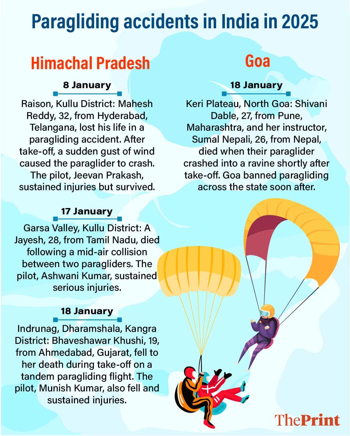 On 18 January, the young woman from Gujarat died when her pilot crashed during take-off at Dharamsala. A day before that on 17 January, a man from Tamil Nadu died in a mid-air collision with another paraglider in Kullu. And on 8 January, a man from Telangana died in a paragliding clash in the same region. The three paragliding-related deaths in Himachal Pradesh in quick succession, as well as a fourth in Goa, also in January, have served as a wake-up call for governments, police and tour operators.
