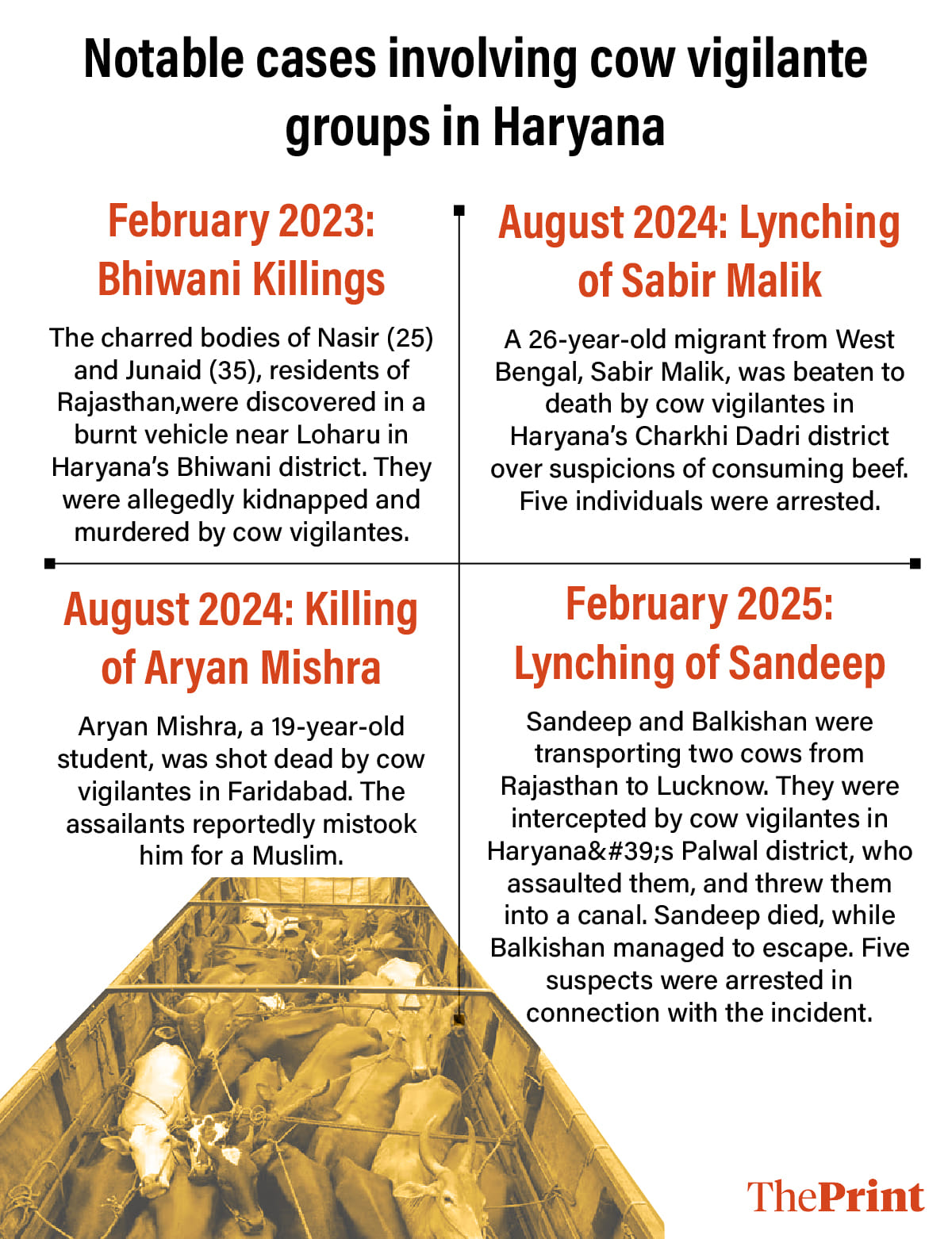 Cow vigilantes in Haryana are taking the law into their own hands, empowered by a 2015 Act that bans cow trafficking, slaughter, and the possession or consumption of beef in the state. In February 2023, the charred bodies of Nasir and Junaid, residents of Rajasthan, were found in a burnt vehicle in Bhiwani, Haryana. They were allegedly abducted and murdered by local cow vigilante groups. In August 2024, Sabir Malik, 25, a ragpicker from West Bengal, was lynched by a mob for allegedly consuming cow meat.