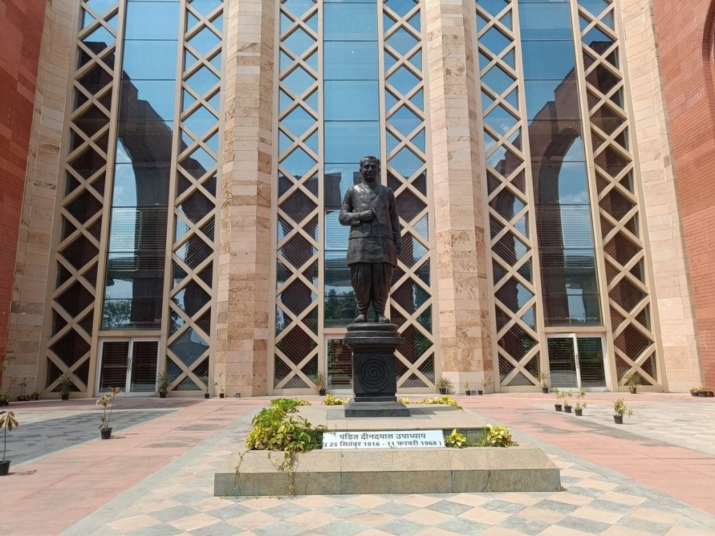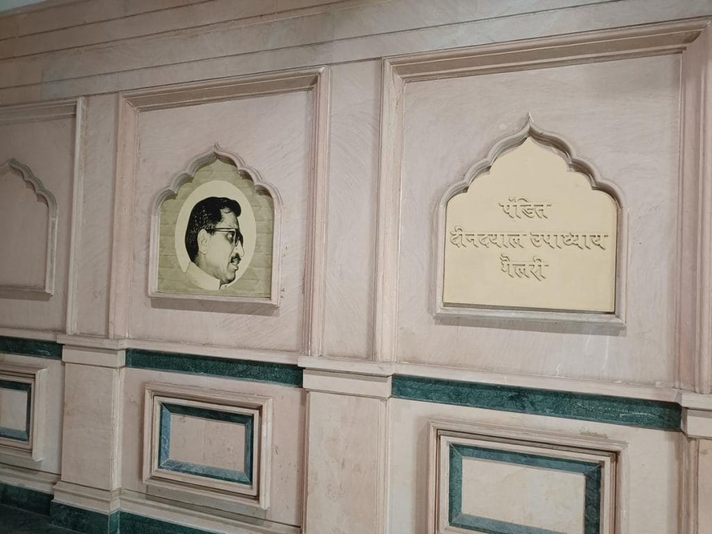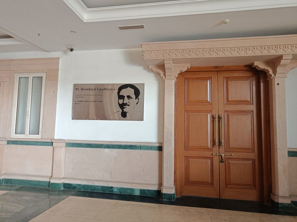 A towering statue of Bharatiya Jana Sangh leader Deendayal Upadhyaya also stands at the entrance, and the museum is named after him as well. His image hangs on the museum wall, with an information plate that reads: Welcome to the world of Geo-Cultural Nationalism.