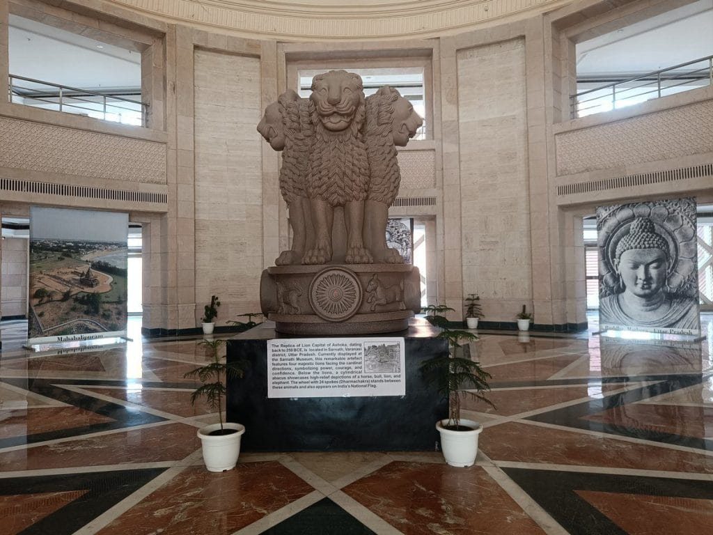 The building is based on the ancient principles of Vastu Shastra, almost square in geometry, with a Brahmasthan in the lobby displaying a replica of Sarnath’s Lion Capital of Ashoka. The corridors are full of banners of the ASI’s ambitious new excavation sites — Sanauli, Binjor, Barnawa. A panel at the entrance declares the campus is designed on the principles of green building architecture and energy-sufficient practices such as use of solar energy and water conservation.