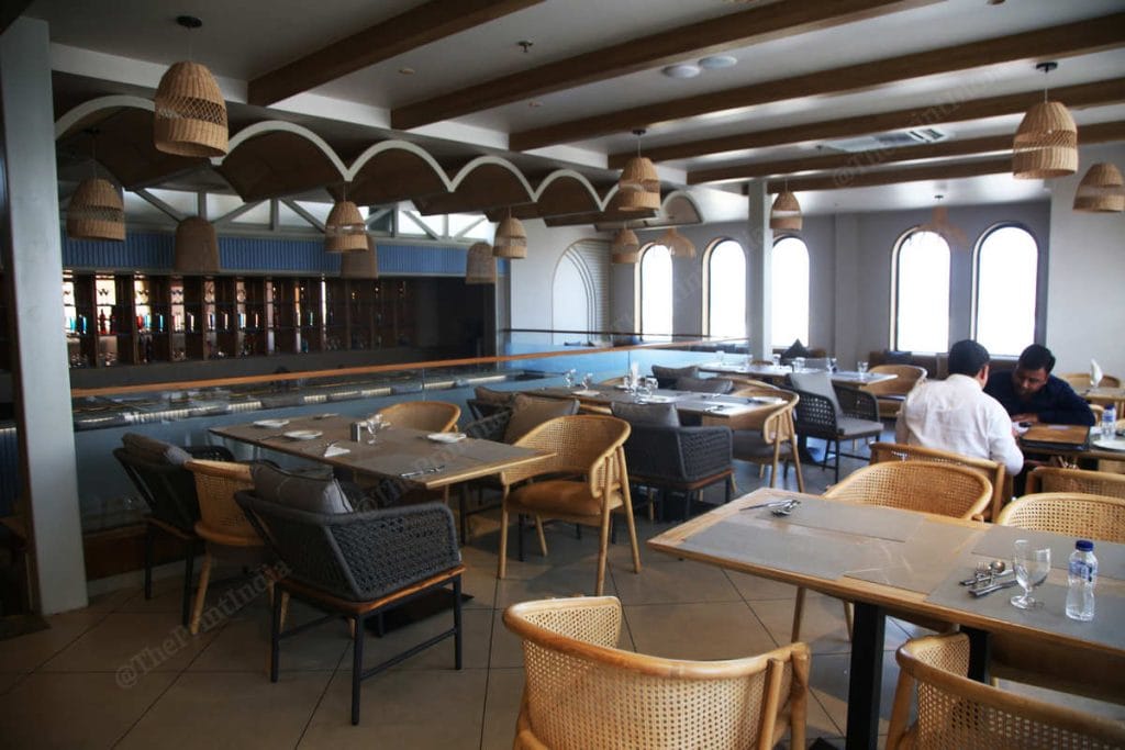 Huge wooden padukas (sandals) symbolising Ram decorate the entrance, but the place gives off a beachy vibe with white tents, recliners, and canopies.