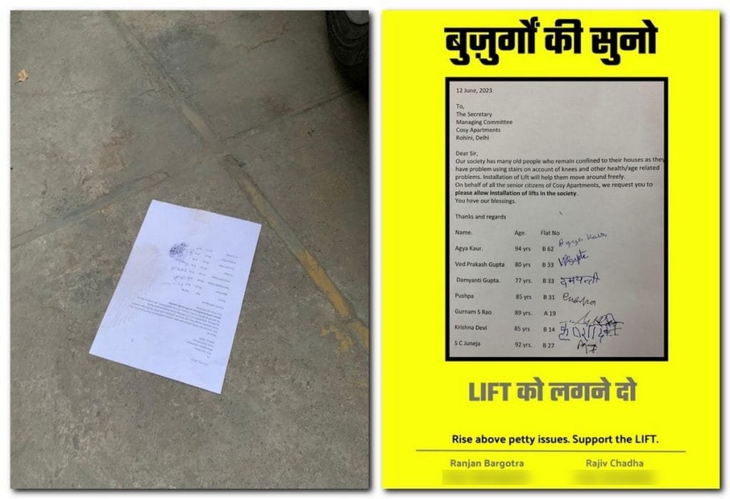 “Sunlight, ventilation, space—everything is being destroyed because of poor planning,” he complained. “If lifts are for senior citizens, why are they blocking the air and light of elders living on the ground floor?”