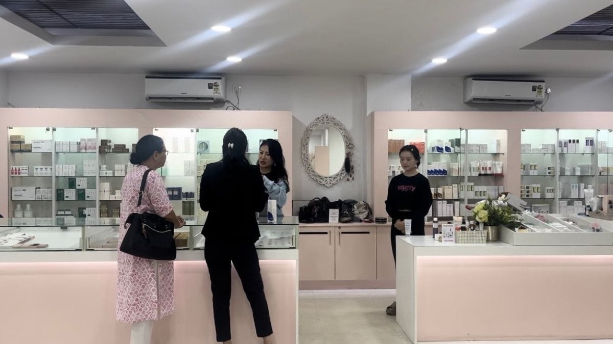 Back in the Beauty Barn’s store in Dimapur, which opened in 2018, staff members are busy stacking up the shelves with fresh stock. Row upon row of flashing brands such as I’m from, Beauty of Joseon and Soon Jung fill the cabinets.