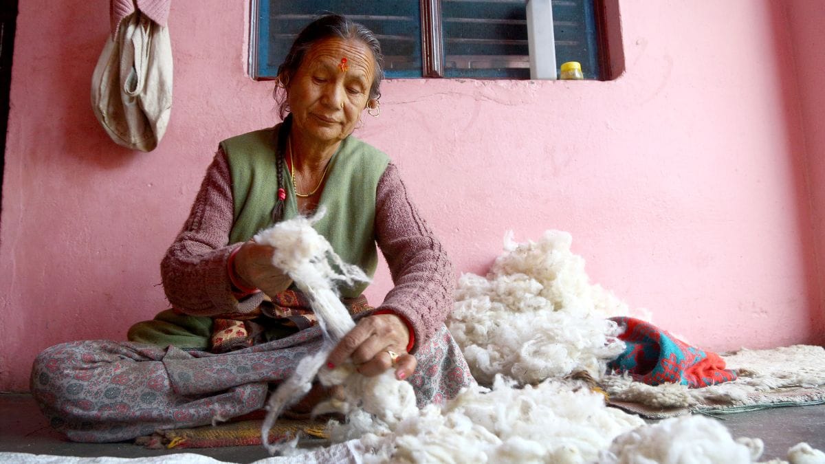 The people of Nelong and Jadung too move to Veerpur in Dunda Panchayat, about 90 km from Bagori. While the houses in Bagori are small and made of wood, Veerpur village has two-storey houses. Jaspal Singh Rawat sat at his Veerpur house, surrounded by wool. Wool work has been passed on in the village through generations and is the main source of livelihood. “Since we still do sheep rearing, we earn money by selling things made from their wool in the market. This work is done in dozens of houses,” he said.