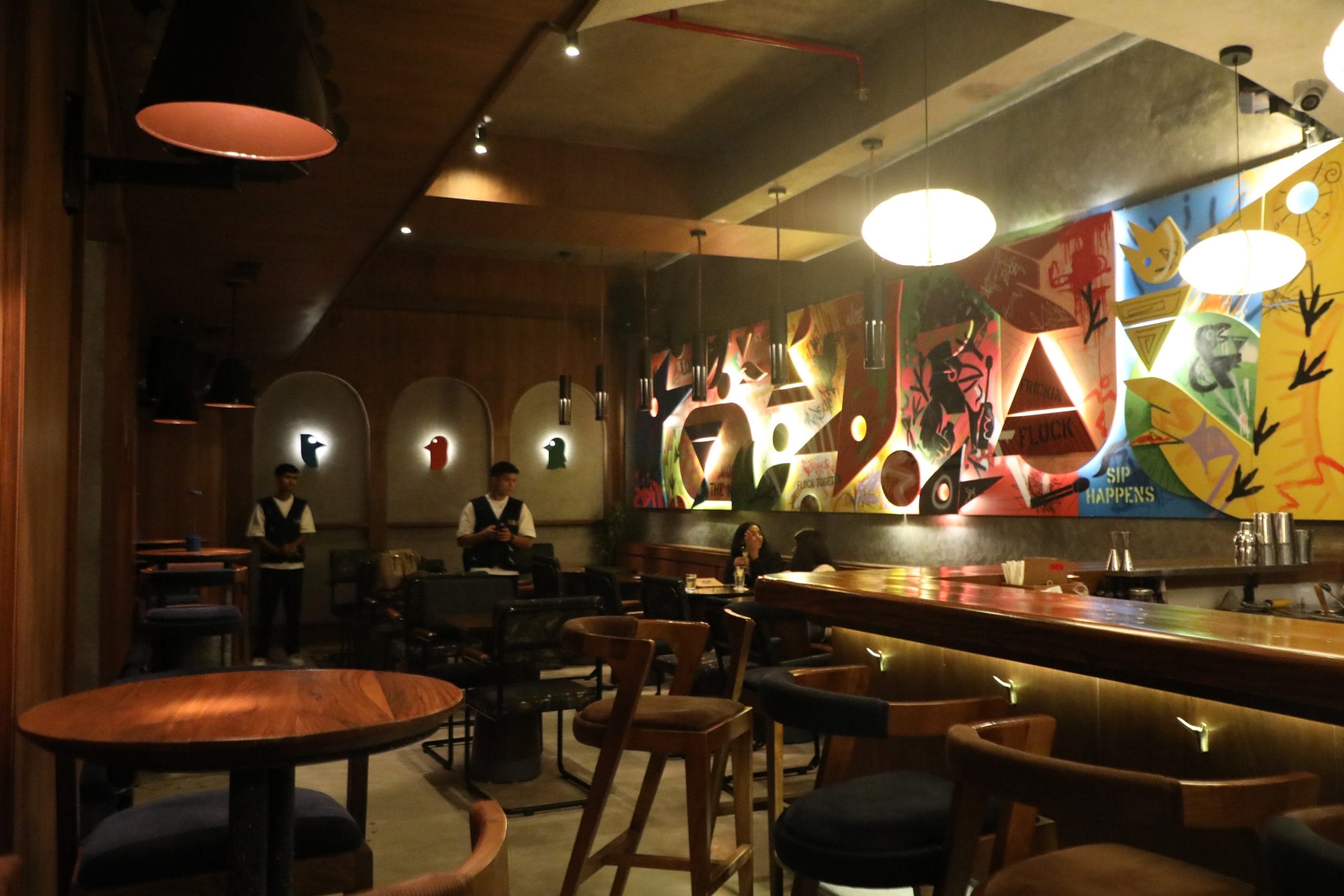 Their mountain hamlet-inspired bar is covered in bird-themed artwork that spills across the walls, bar counter, and even the floor. The staff wears olive-green birdwatcher vests as uniforms.