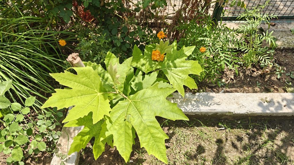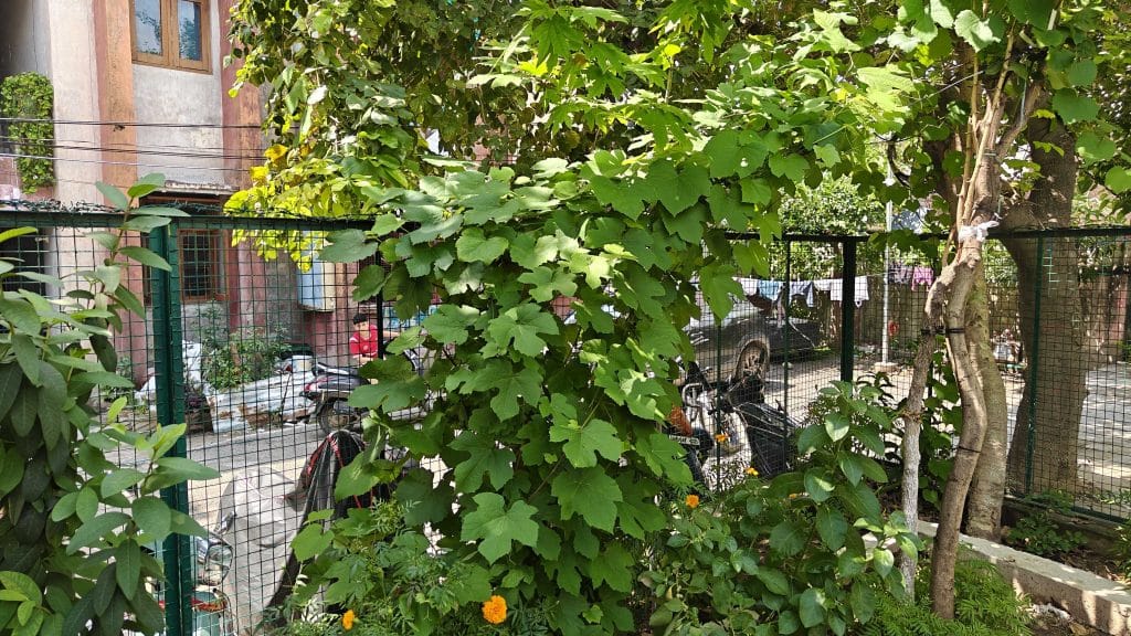 In the park of the migrant quarters at Buta Nagar camp in Jammu, a young Chinar tree is sprouting its first leaves. Nearby are grapevines and roses. All the seeds were brought from Kashmir, unsuitable for Jammu’s climate but coaxed to grow. Residents spend hours tending to this garden.