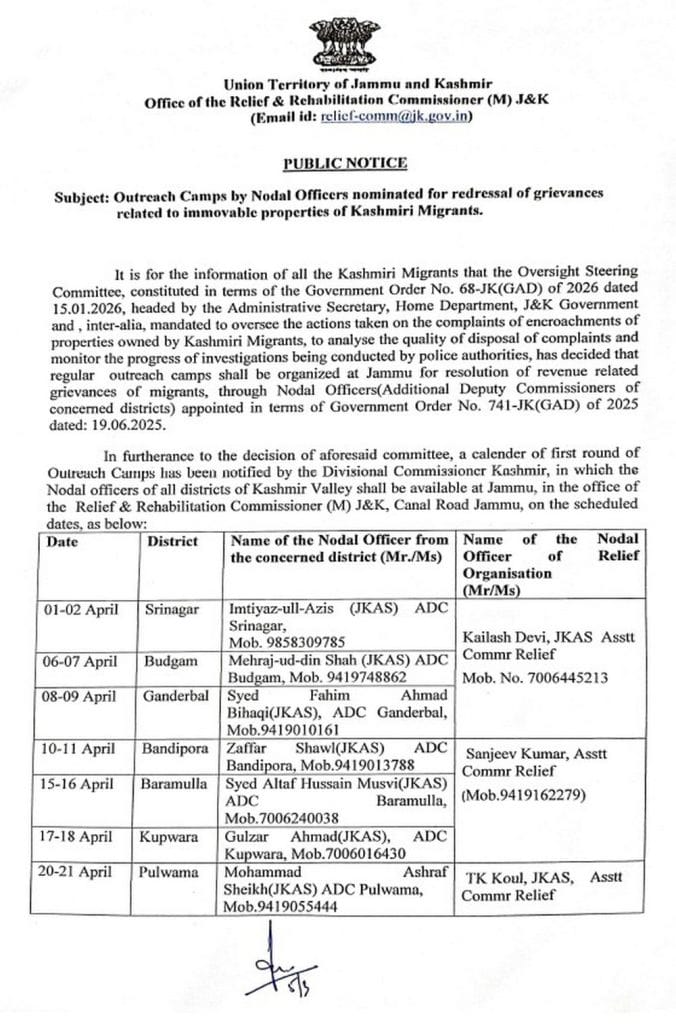 The new “regular outreach camps” were announced in a 5 March public notice. It followed a 15 January decision by the J&K government to form an Oversight Steering Committee to monitor complaints of encroachment on Kashmiri Pandit properties, “analyse the quality of disposal of complaints”, and track the progress of investigations by the police. The district-wise schedule of hearings began on 1 April with Srinagar and then on to other districts such as Pulwama, Budgam, and Ganderbal.