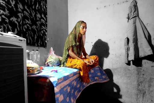 “I have to look younger,” she says. The men sit on a cot, watching her critically. Before negotiating with Pinku, they insist that she dance for them. Karishma obliges, swaying her hips, running her fingers through her hair, and winking—enough to seal the deal.