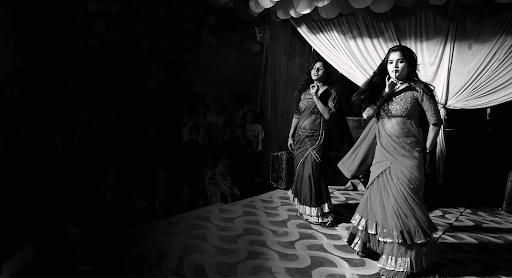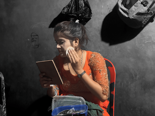When they arrive at the remote village venue, the trio rushes to a dingy, dimly lit changing room. Using water from a rusty bucket, they wash their faces, hurriedly apply bright red lipstick, slip into glittering lehengas, dab on foundation, and whip their hair loose in one swift motion.