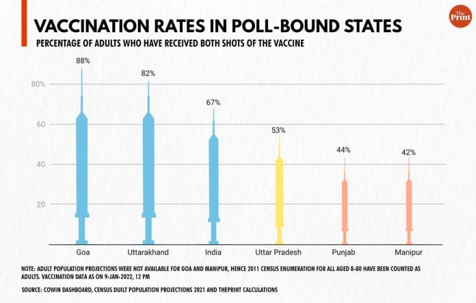 New Delhi: With less than a month to go for assembly elections in five states, nearly half of the eligible adult population in three of the states — Uttar Pradesh, Punjab and Manipur — is still not fully vaccinated against Covid-19, shows data on the government’s web portal CoWIN.