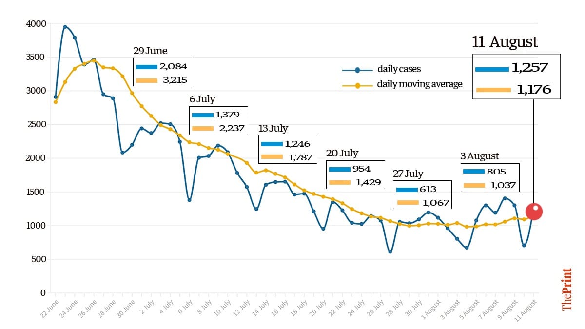 The seven-day daily moving average (average of daily cases over seven days) also increased in the past week. According to data available on Covidtoday.in, this moving average increased from 988 on 5 August to 1,176 on 11 August.