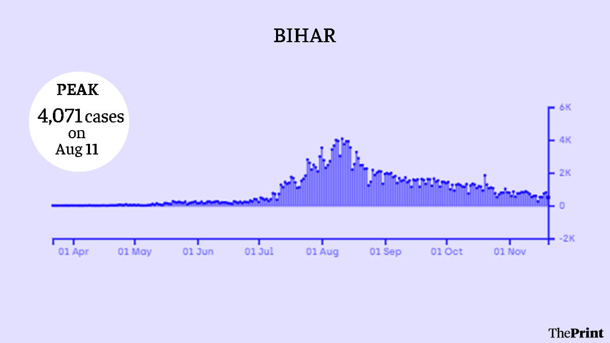 Bihar has, surprisingly, registered a low rate of infections. The state has recorded only 2,30,632 cases till 22 November, hitting its peak on 11 August with 4,071 daily cases. Since then, the number of daily positives has gone down significantly with 385 cases recorded in the last 24 hours.