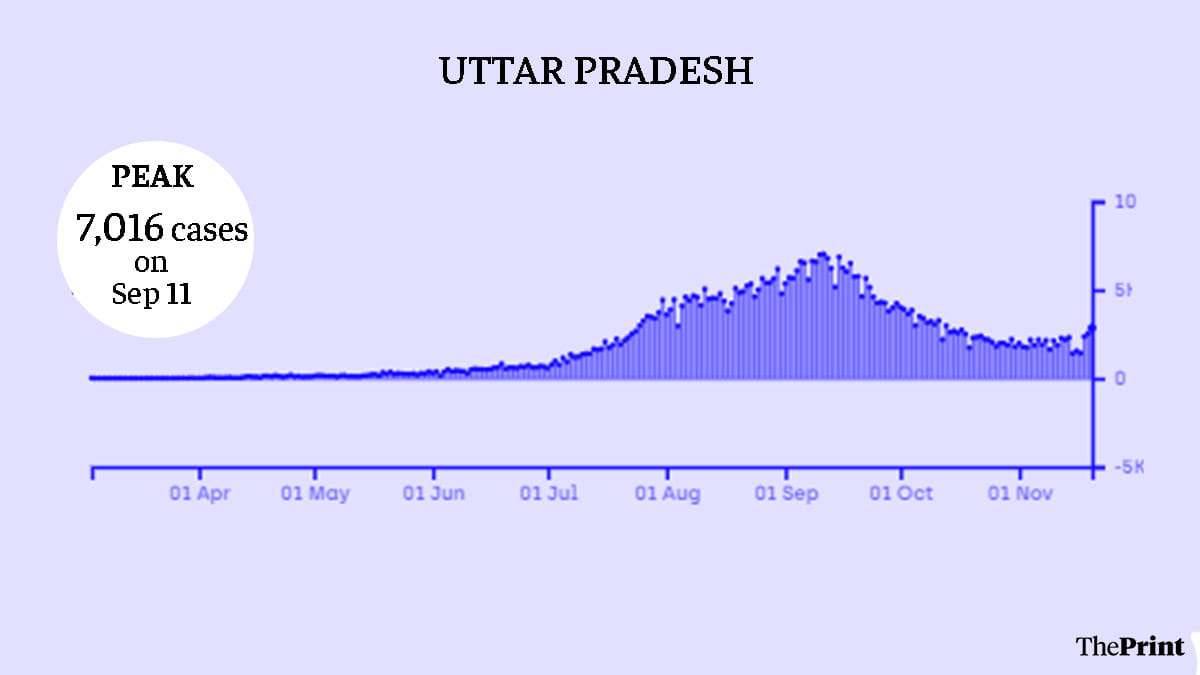 At the height of its Covid-19 peak, Uttar Pradesh saw 7,016 cases on 11 September. Since then, the number of cases has come down significantly, with 2,557 cases registered Sunday. State authorities note that the decrease in cases is due to strict surveillance and testing.