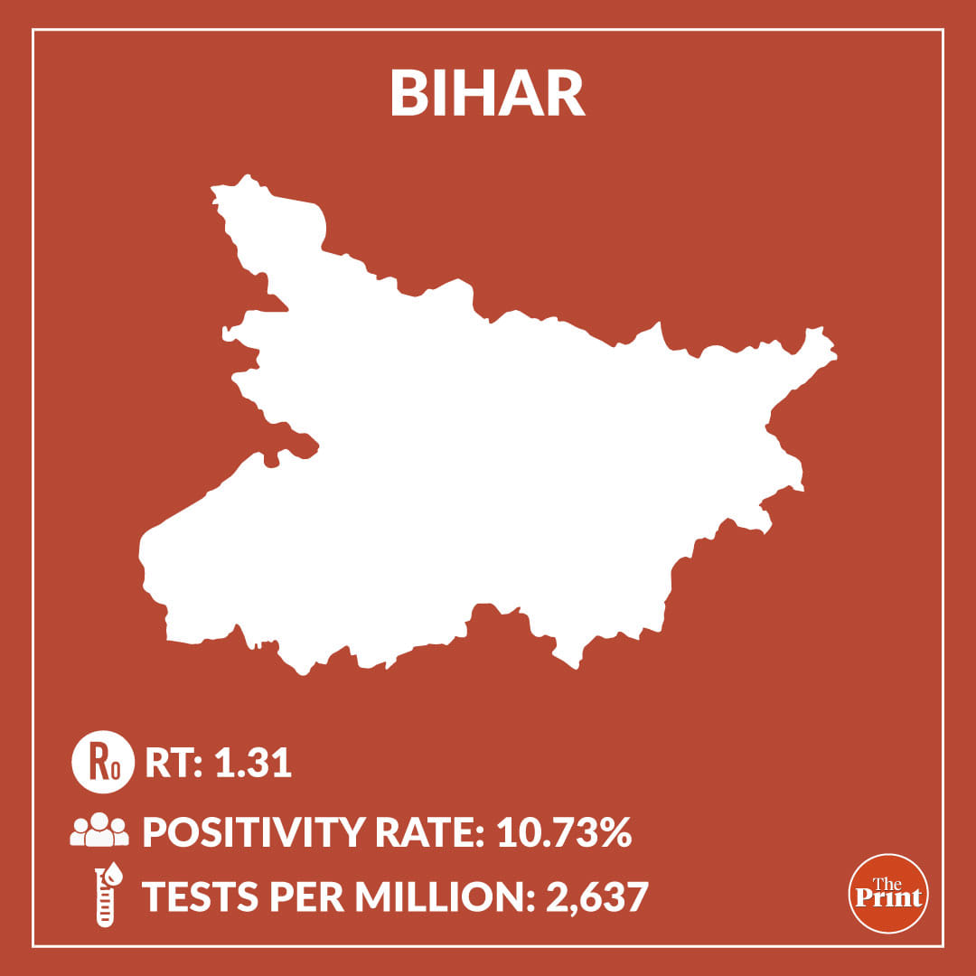 Bihar has recorded an Rt value of 1.31 and has a positivity rate of 10.73 per cent. The state has conducted the lowest number of tests per million in the country — 2,637.