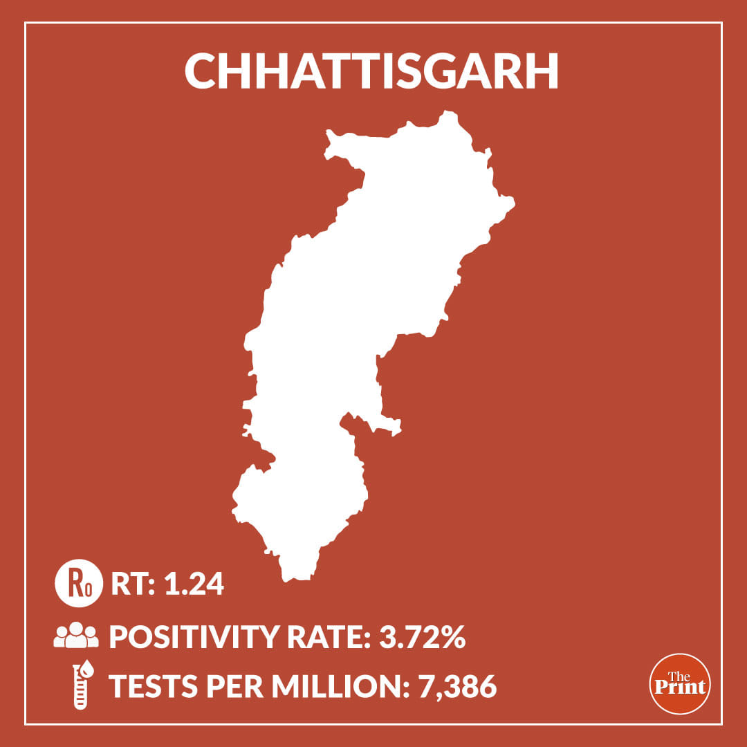 Chhattisgarh has an Rt value of 1.24, same as Uttar Pradesh. It has recorded a positivity rate of 3.72 per cent and has conducted 7,386 tests per million so far. The state government on Tuesday issued a list of red, orange and green zones across 112 blocks in 25 districts to combat the spike in cases.